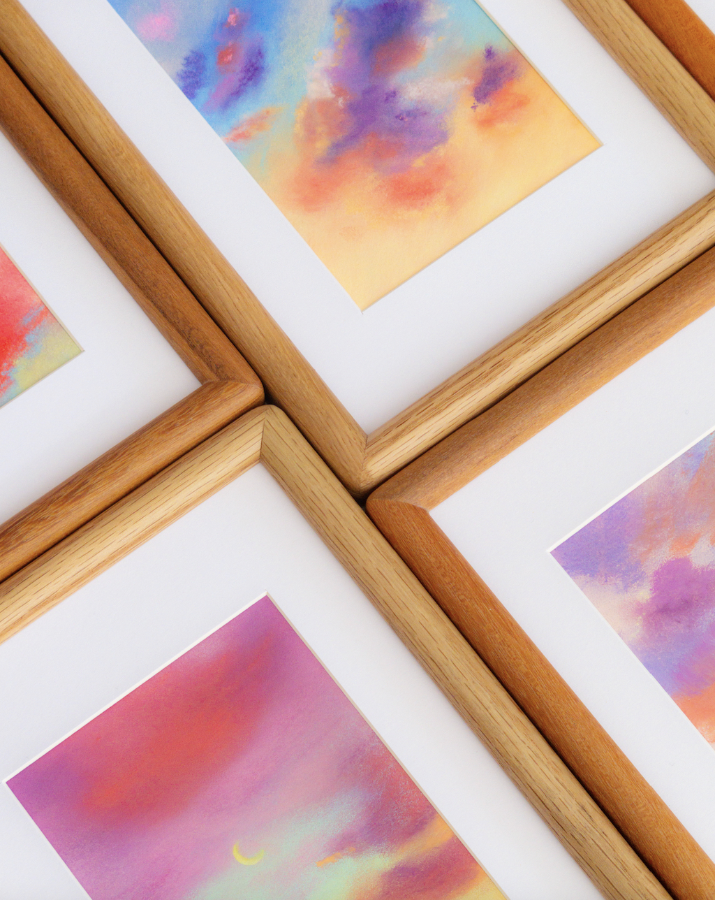 La collection Blooming Skies est née du désir d’explorer ces instants fugitifs, au lever et au coucher du soleil, où les nuages se parent de teintes florales. Le ciel devient alors un jardin suspendu, où se noue un dialogue silencieux entre ce qui est éphémère et ce qui s’enracine. Le pastel tendre, par sa texture douce et veloutée, accompagne cette quête d’intemporalité, tout en donnant aux tableaux la densité de souvenirs anciens. Ode aux élans fugitifs des nuages, à la patience du végétal et aux paysages intérieurs qui nous composent, ces ciels en fleur invitent à contempler, à respirer, à demeurer - là où la couleur devient mémoire et l’instant, éternité.