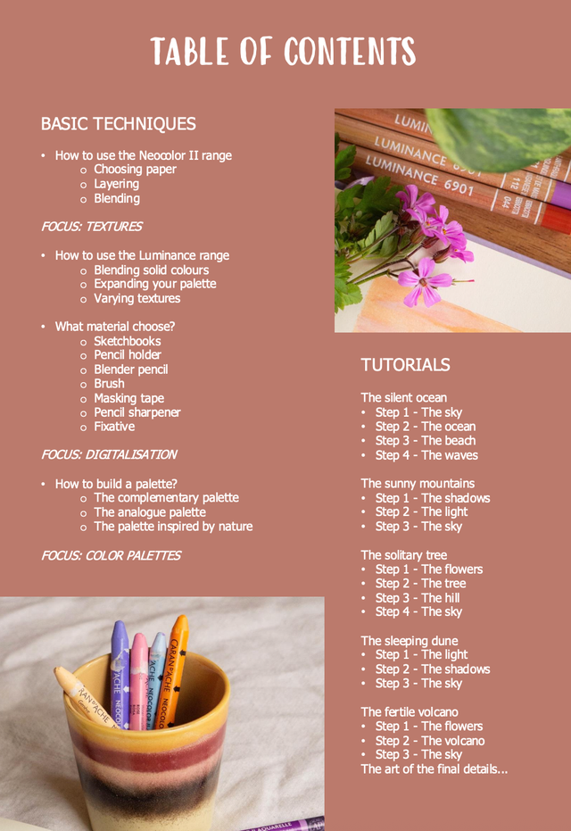 The first section of the guide, focused on technique, provides all the explanations and tips you need to understand and combine wax pastels with colored pencils, as well as to build your color palettes. The second chapter is dedicated to creating 5 landscapes. Each tutorial guides you through a different natural ecosystem. This eBook allows you to work at your own pace while making rapid progress.