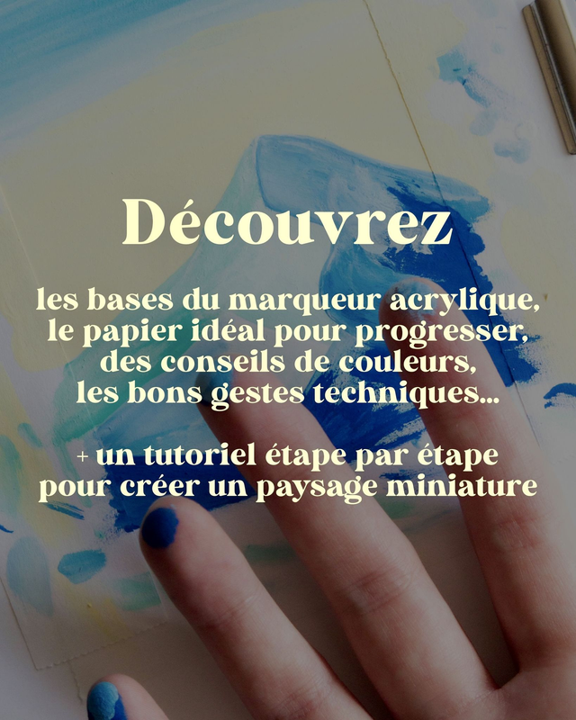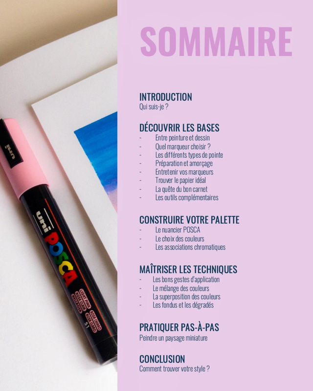 Découvrez toutes les techniques du marqueur acrylique, et plus particulièrement du Posca, dans ce guide complet de 30 pages. La première partie vous apporte les bases pour débuter sereinement, la seconde vous aide à construire vos palettes et comprendre les couleurs, et la troisième révèle comment réaliser des dégradés et des effets subtils. Vous pourrez ensuite passer à la pratique avec un exercice pas à pas pour créer un paysage miniature, apprendre les bons gestes et exploiter pleinement ce médium entre dessin et peinture.