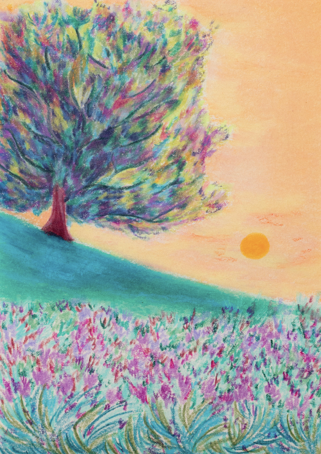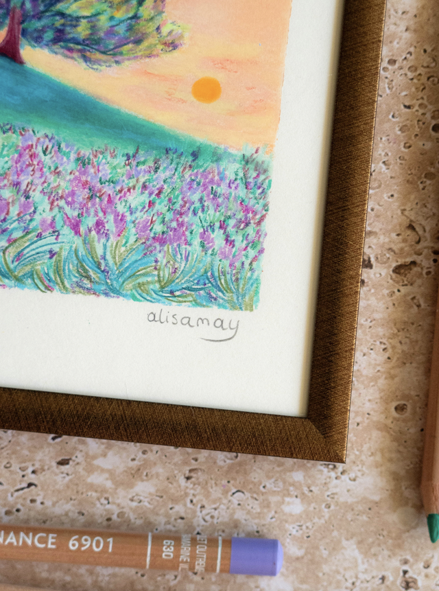 Œuvre originale encadrée, pastels à la cire & crayons de couleur sur papier, série "Jardins sauvages" (printemps 2025).